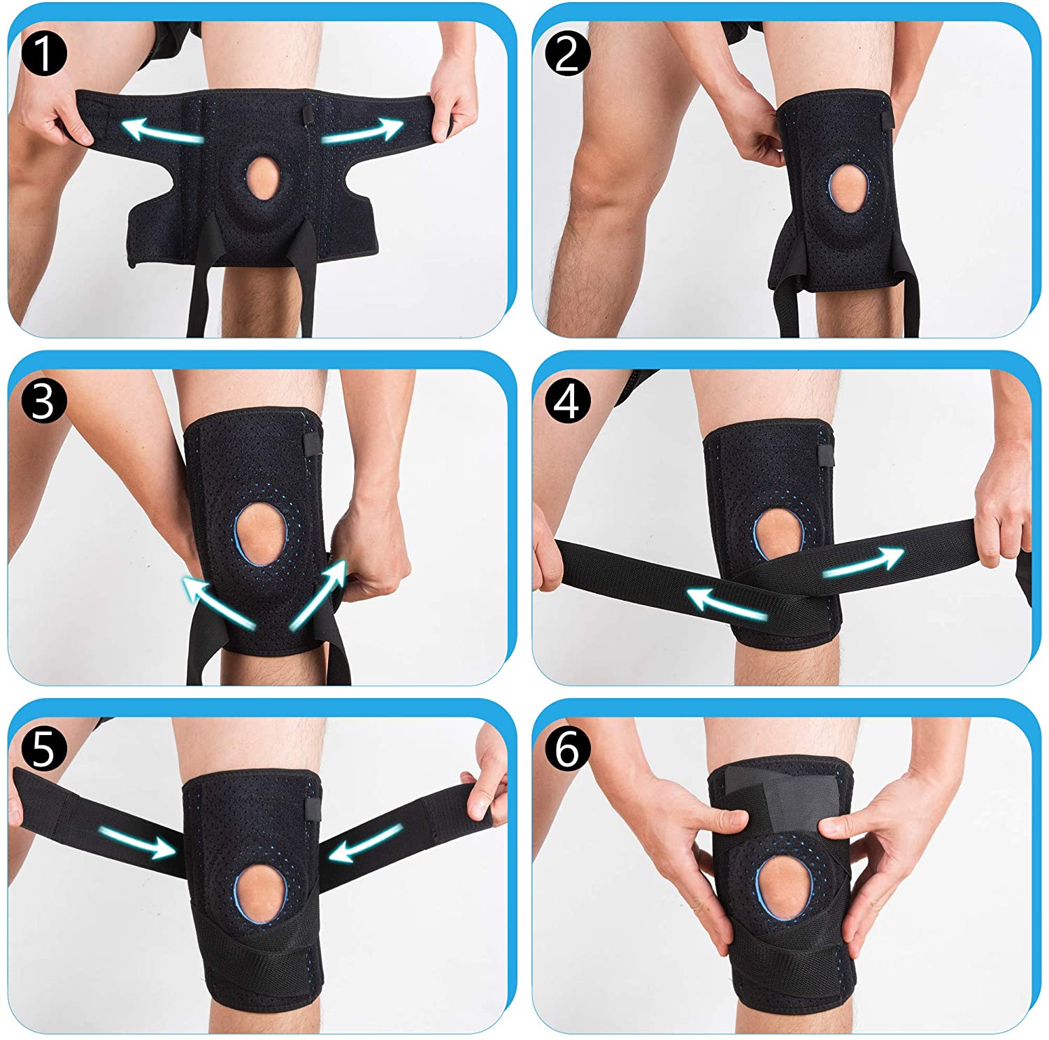 - Wrap the bottom strap and secure it at the back of the knee.